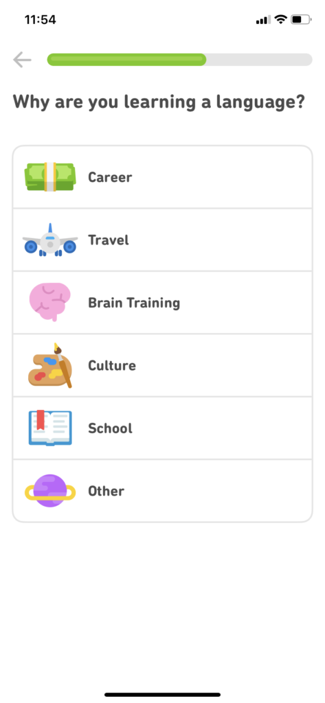 Duolingo actually begins their onboarding process during signup, with a focus on identifying a user’s “why.”