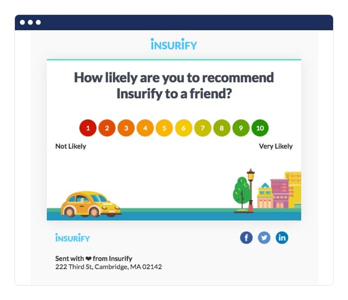 You should also analyze NPS ratings from users after they’ve submitted support tickets. Gauging sentiment after these interactions can let you know whether the issue was truly resolved and the customer is happy. To gather NPS scores, send a simple email like the Insurify example below.