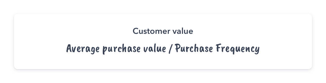 Using the two numbers you’ve just calculated, you can find your customer value. An average purchase value of $100 over a purchase frequency of 1.6 gives you a customer value of $62.50.