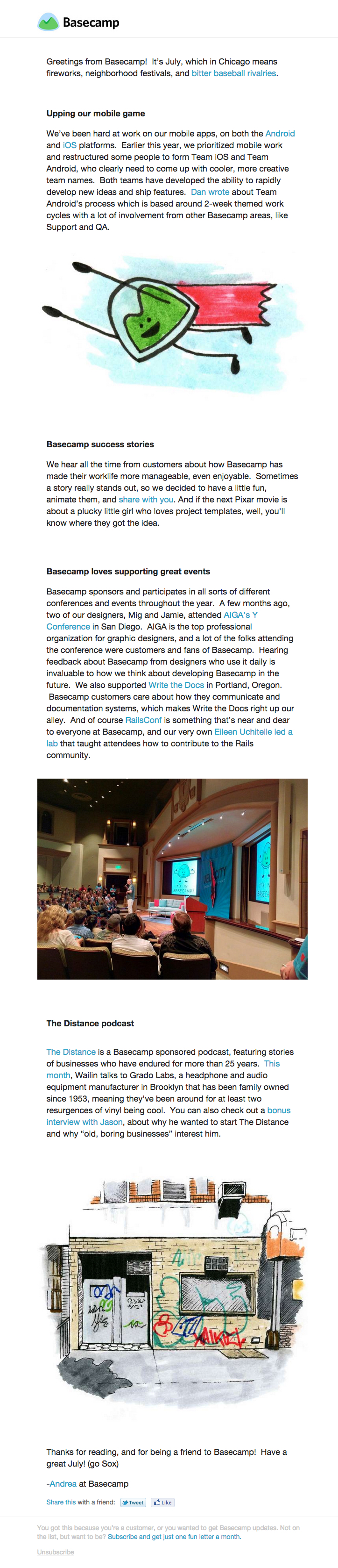 Basecamp uses a similar approach in their newsletters, which include the latest customer stories. They’ve actually dedicated a section of their site to customers stories, so this isn’t specific to their emails.