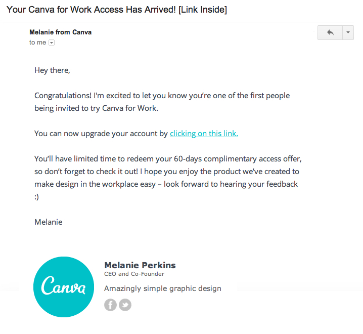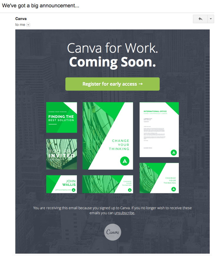 Clicking that email brought users to the Canva for Work landing page, where they could opt-in for more information, early access and freebies.