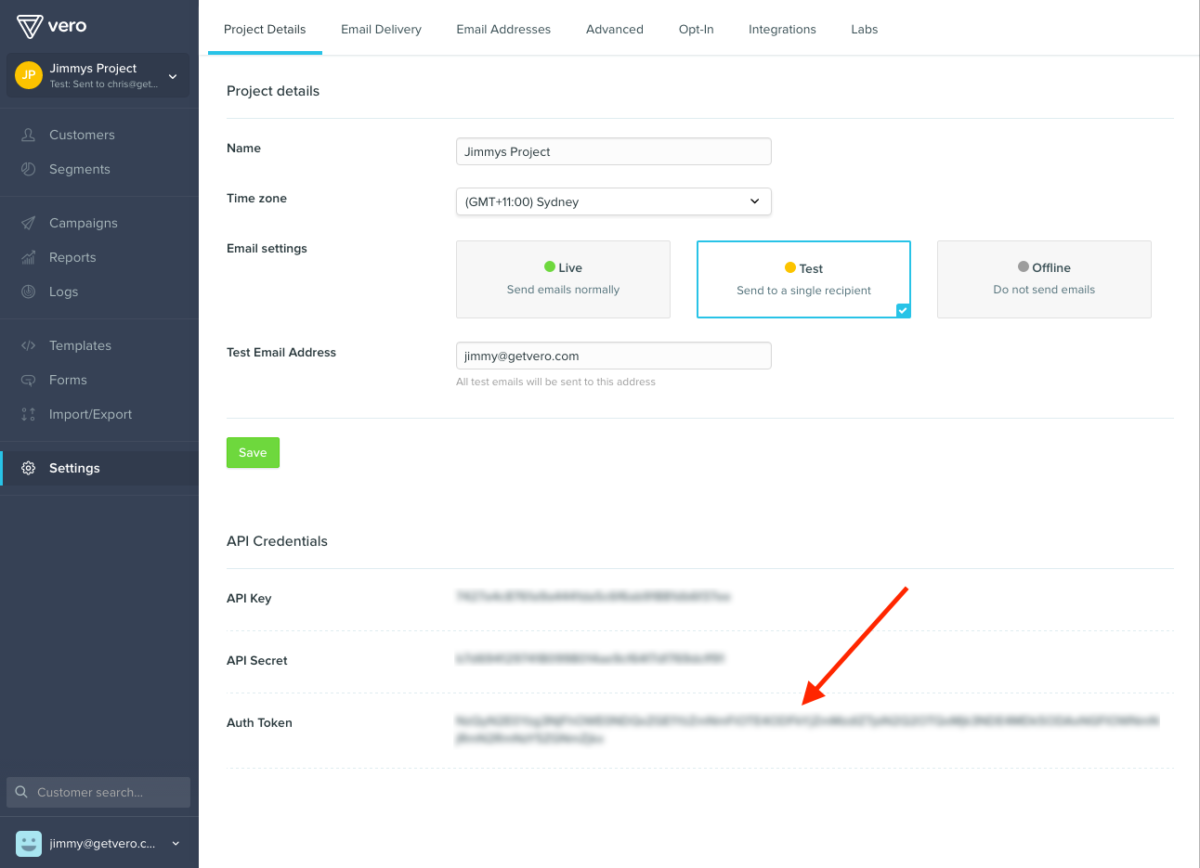 Click the Vero logo. Next, you’ll be asked for your Auth Token. You can find this in your project details in settings.