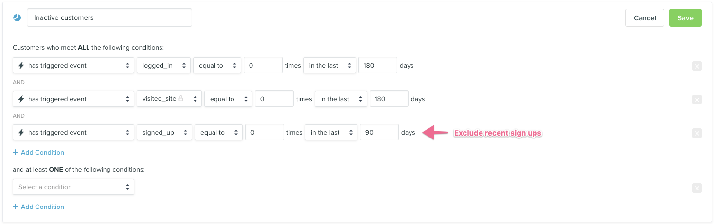 How do you find customers that have been receiving emails for some time but are not engaging with your messages? Create a segment for overall email activity and remove those who have recently signed up: