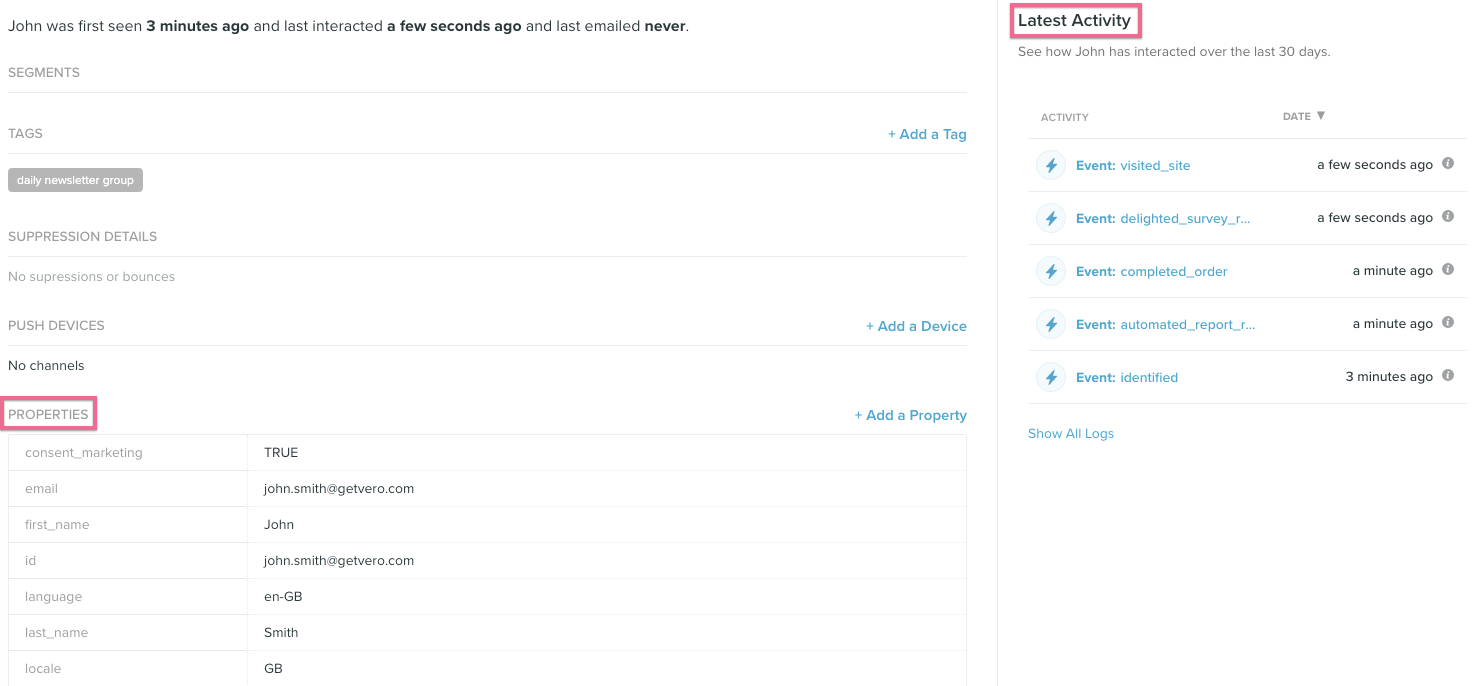 To begin, a reminder on the different types of data stored in Vero. Vero knows of two main data types: user “properties” and user “events”. User properties represent demographic and other customer data and user events represent the on-site or in-app activities the customer has taken. Here is how this data appears on a customer profile in Vero: