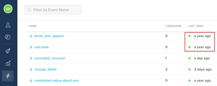 If you head to the “Events” menu in Vero, it’ll show you all the events you have tracked and when they were last “seen.” Here’s an example of two “stale” events, as they have not been seen for around a year: