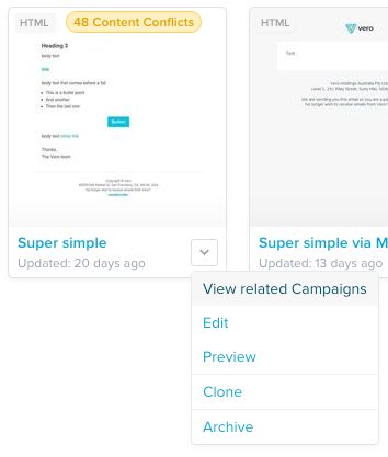 To resolve conflicts, click on each affected campaign in turn. Vero will take you to the affected campaign.