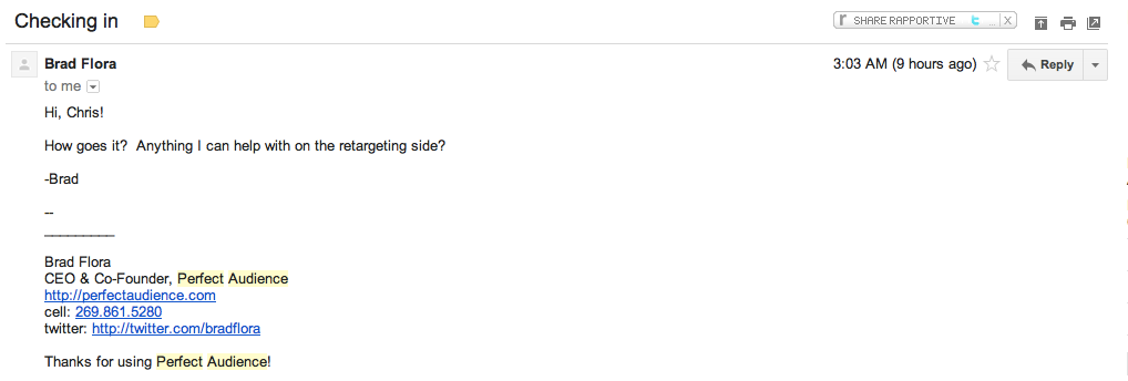 Perfect Audience provides one of the smoothest examples I’ve seen recently. Perfect Audience make it easy to run Facebook remarketing campaigns. Setting up campaigns is super easy and, when you pause one, the guys at Perfect Audience shoot you a very personal email asking you how they can help you better improve your campaign conversions. This email might be automated or it might be hand-written after the support desk receives an automated notification. Either way, it’s a sign these guys sweat the small stuff: