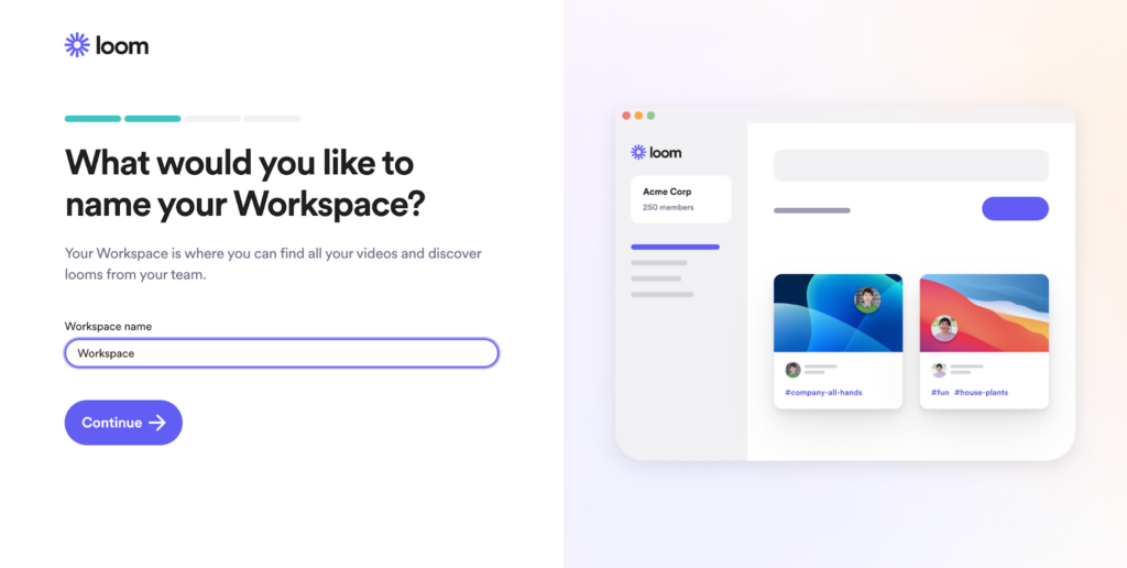 Loom will ask you to answer a few short questions as part of the onboarding process. These include what you intend to use Loom for, what you’d like the name of your workspace to be, whether you’d like to invite your teammates, and which recorder you’d like to use for your videos.
