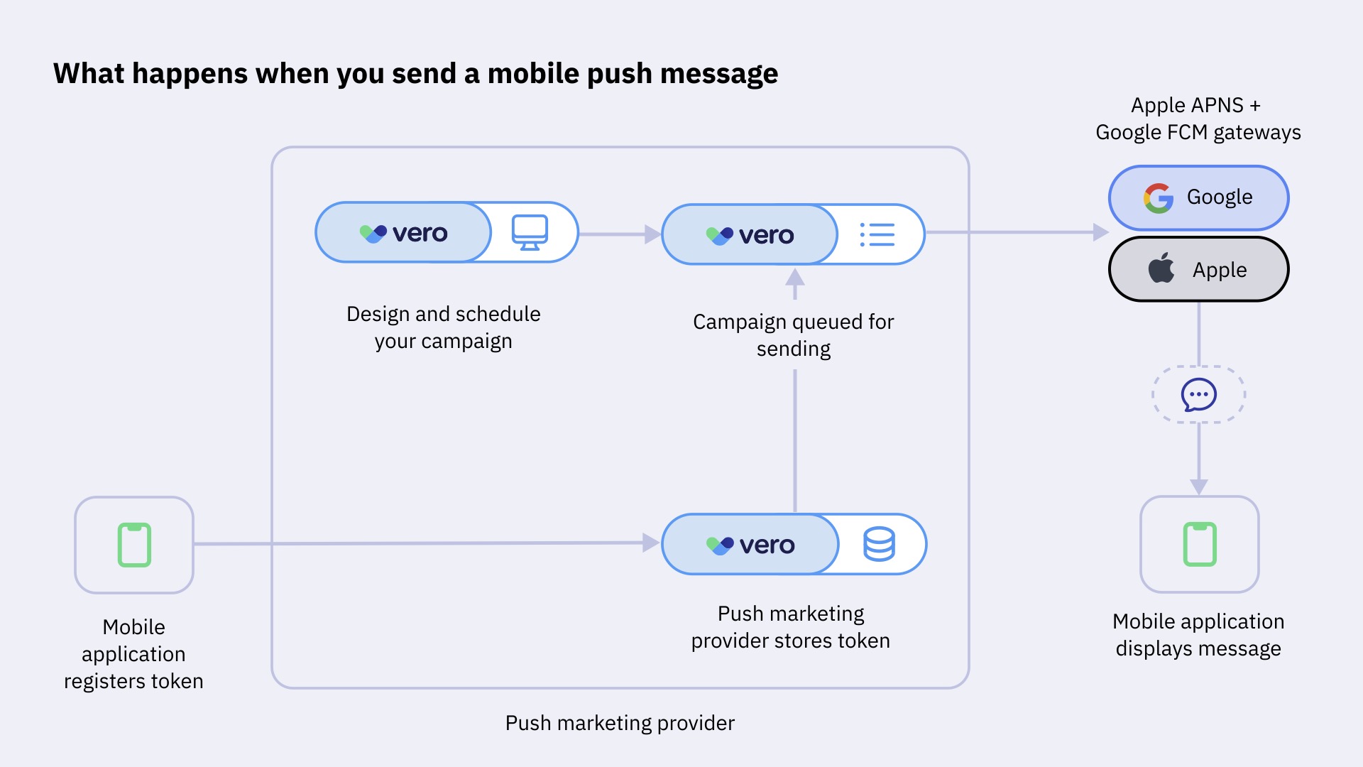 When each message is processed by the “workers” run by your push marketing provider, they will build a version of the message to send to Apple’s and Google’s APIs. In both cases the APIs are proprietary and have a strict format for the message format. As part of this API call, the marketing provider will provide the device token for the destination device.