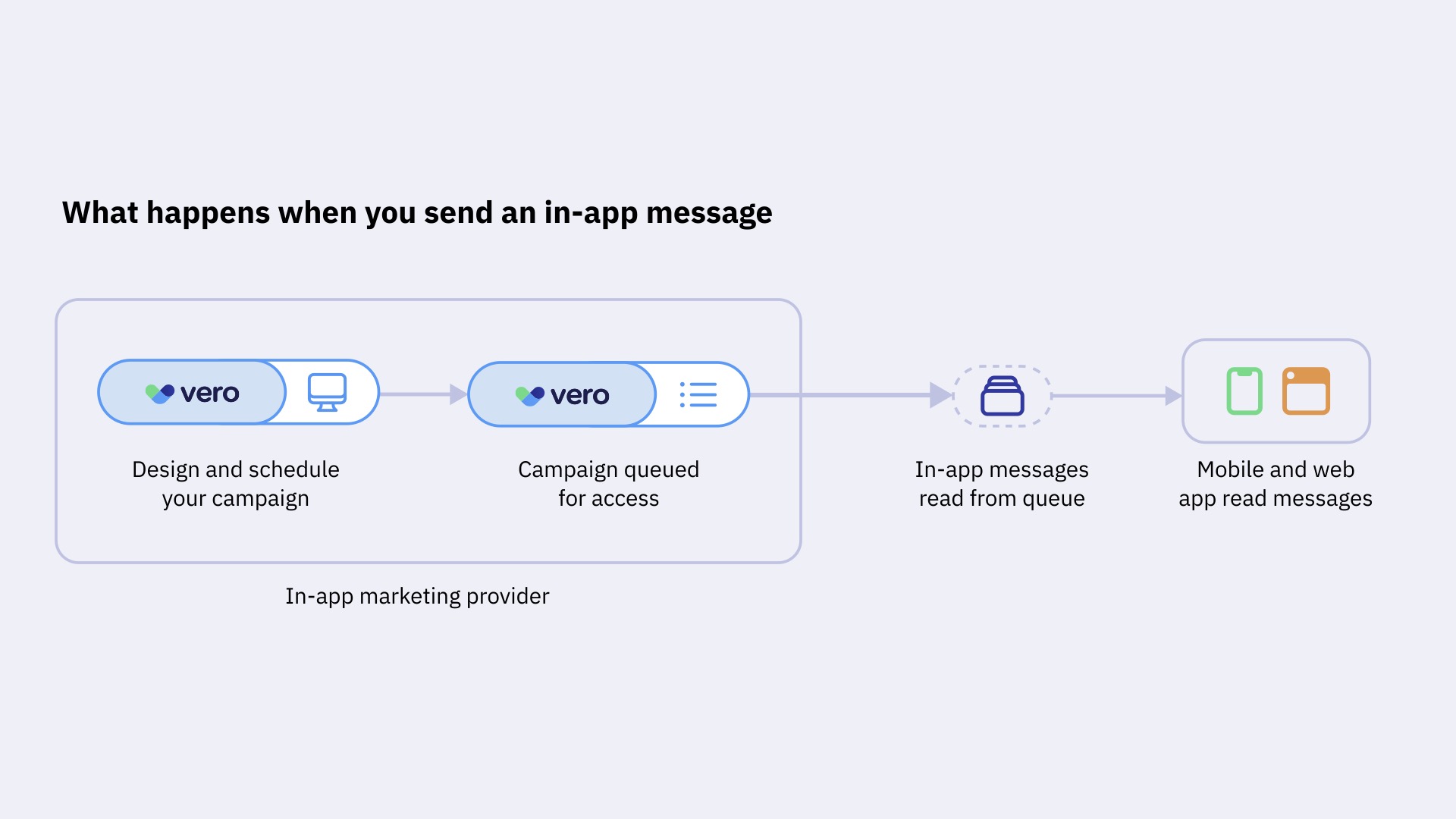 When you queue up an in-app message in your marketing platform, the marketing platform adds this to an internal queue for the recipient users based on the logic you’ve defined (segmentation) and the display rules (e.g. how many in-app messages a recipient can see per week).