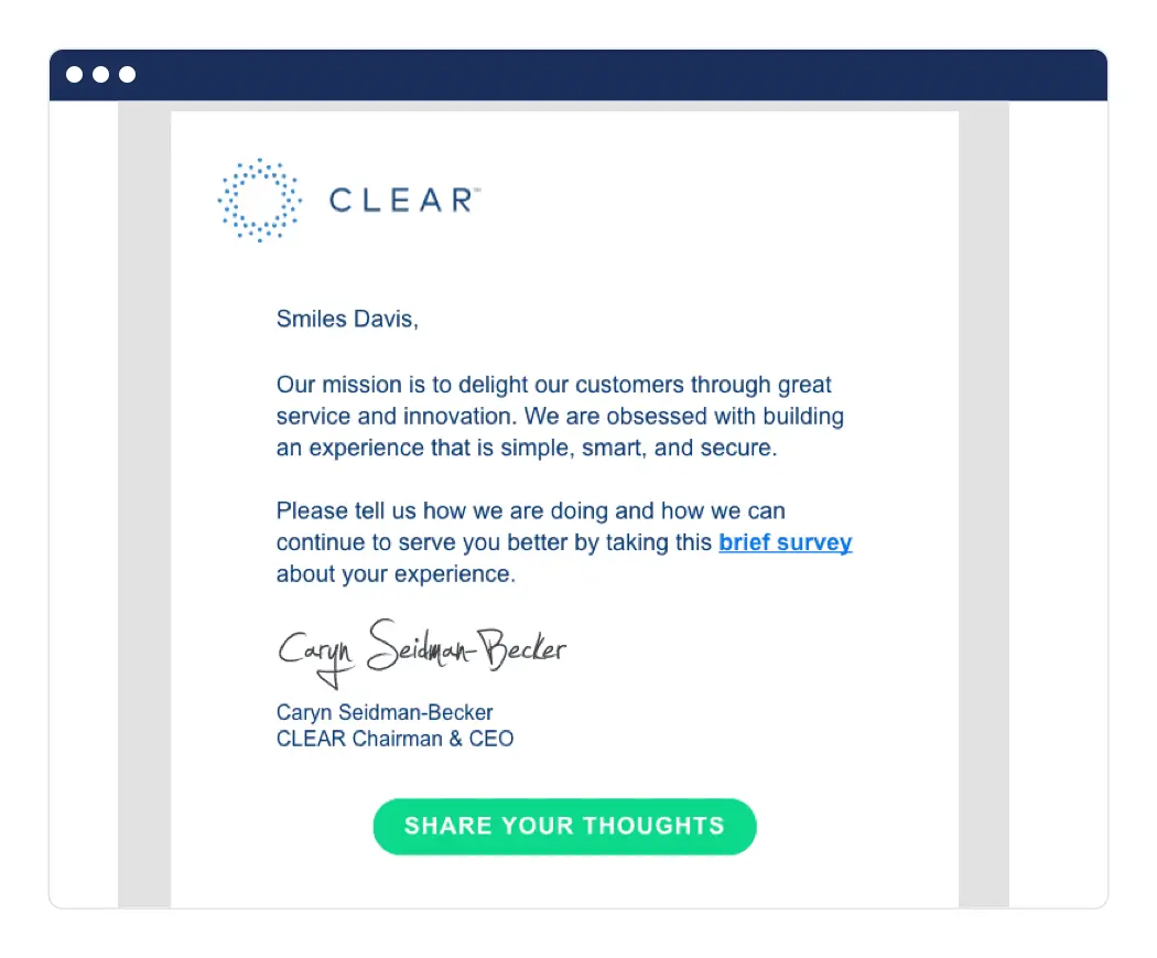 CLEAR has earned another spot in the post with their feedback winback email example. This message is a letter from the CEO and outlines their company mission of “building an experience that is simple, smart, and secure.”