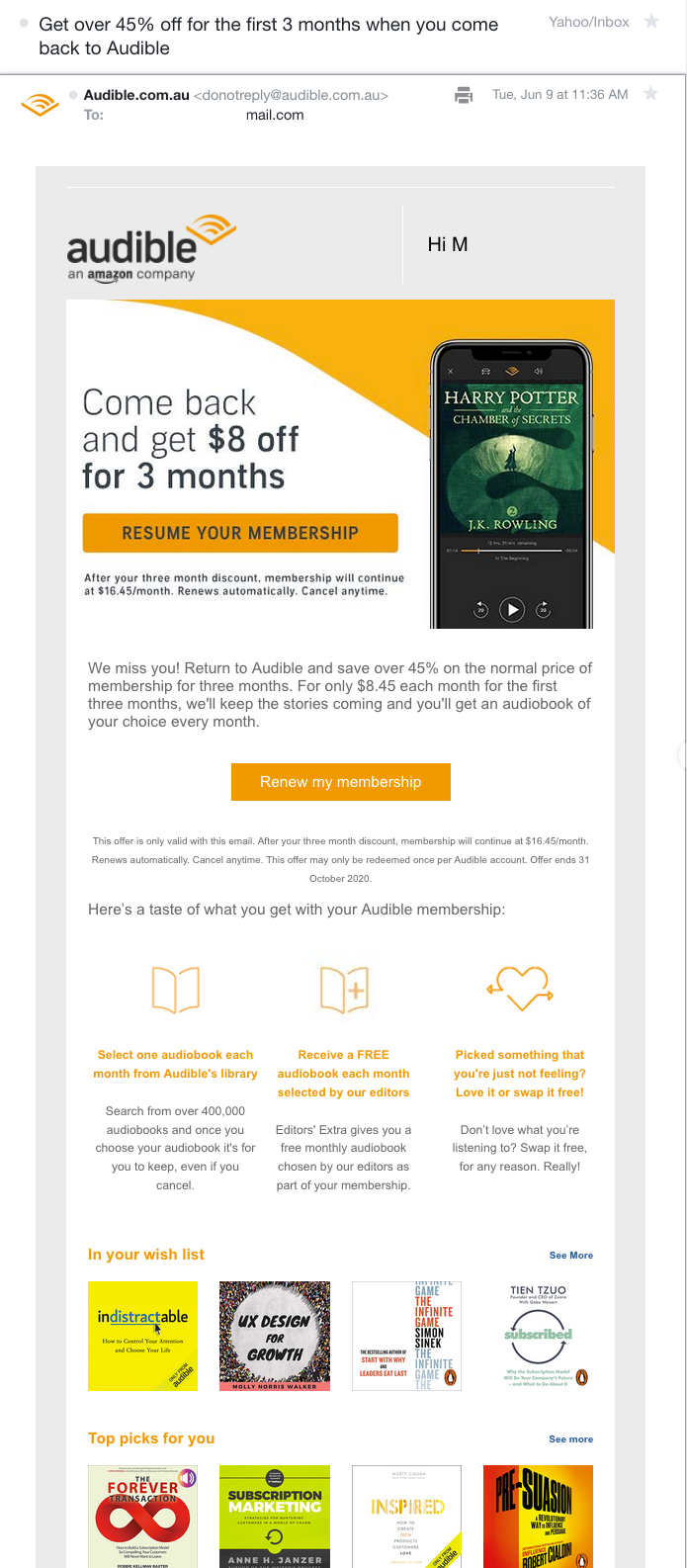 Audible also presents an offer to get 45% off your first three months back with the service. The email clearly outlines the offer, has a “resume your membership” CTA, and lists a few benefits of the service.