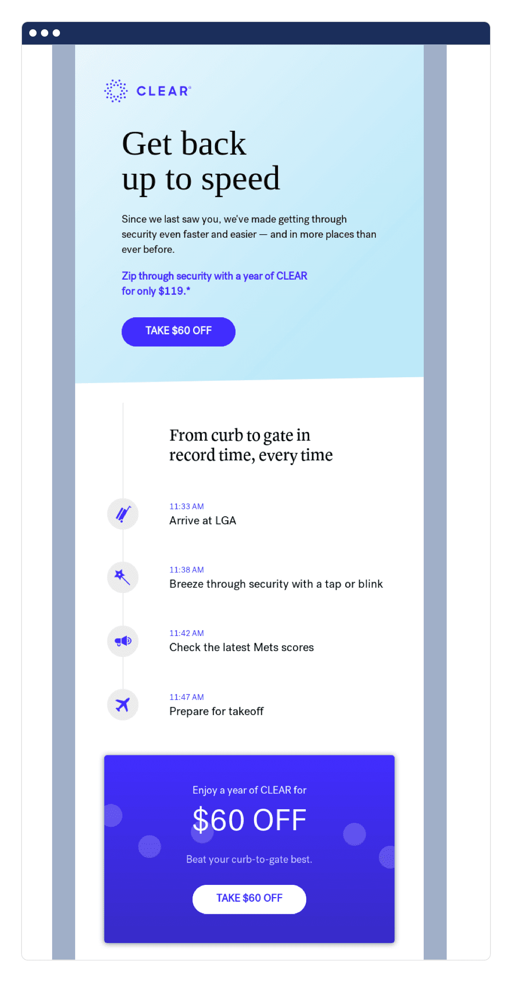 CLEAR also chooses a single benefit to highlight throughout their email. The subject line acknowledges the lapsed time by saying: “[Insert name here], we’re ready to wow you again.” The email also includes the incentive: “Zip through security with a year of CLEAR for only $119.”